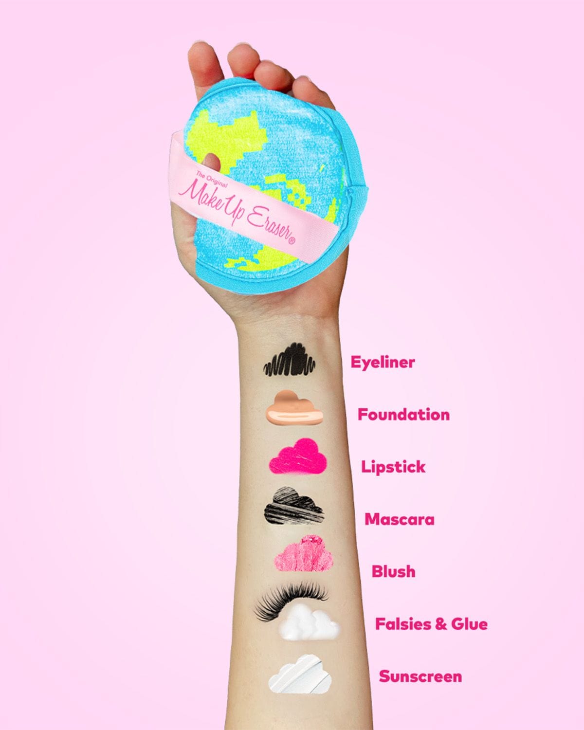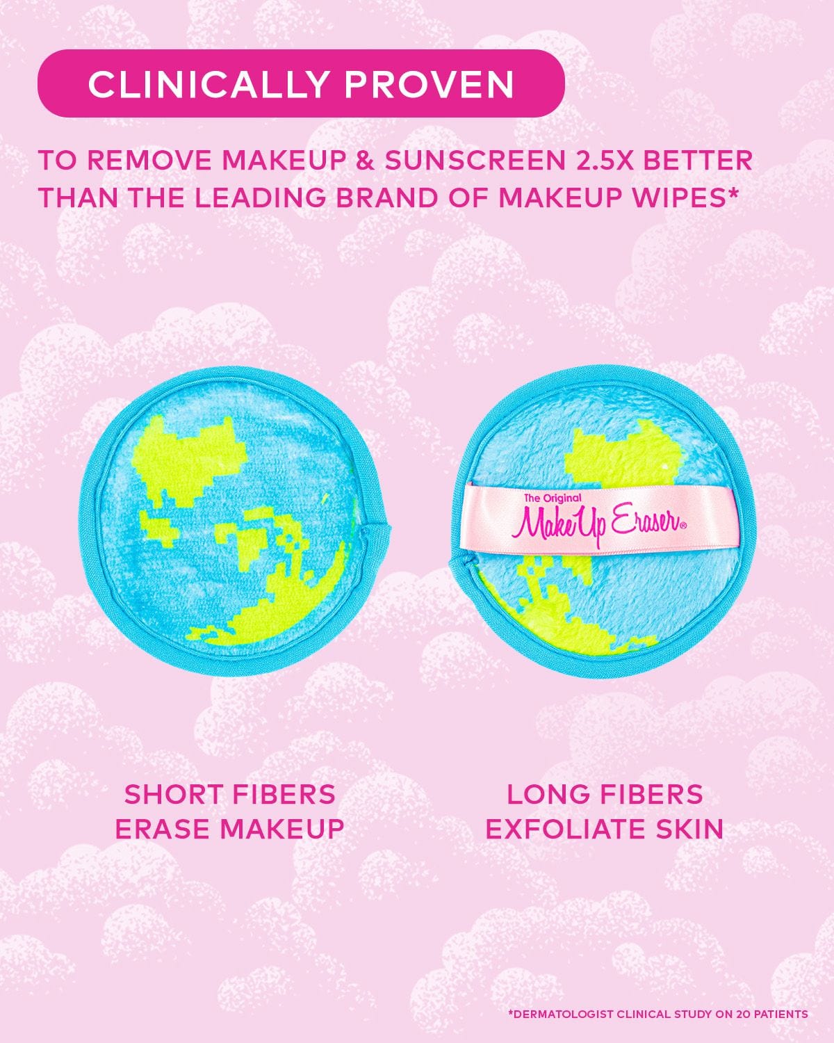 Erase all makeup with JUST WATER™ including waterproof. Our patented, water-activated, cloud-soft fibers gently & easily remove all makeup & sunscreen from pores. 2 in 1 benefit: one side erases makeup & one side exfoliates skin.