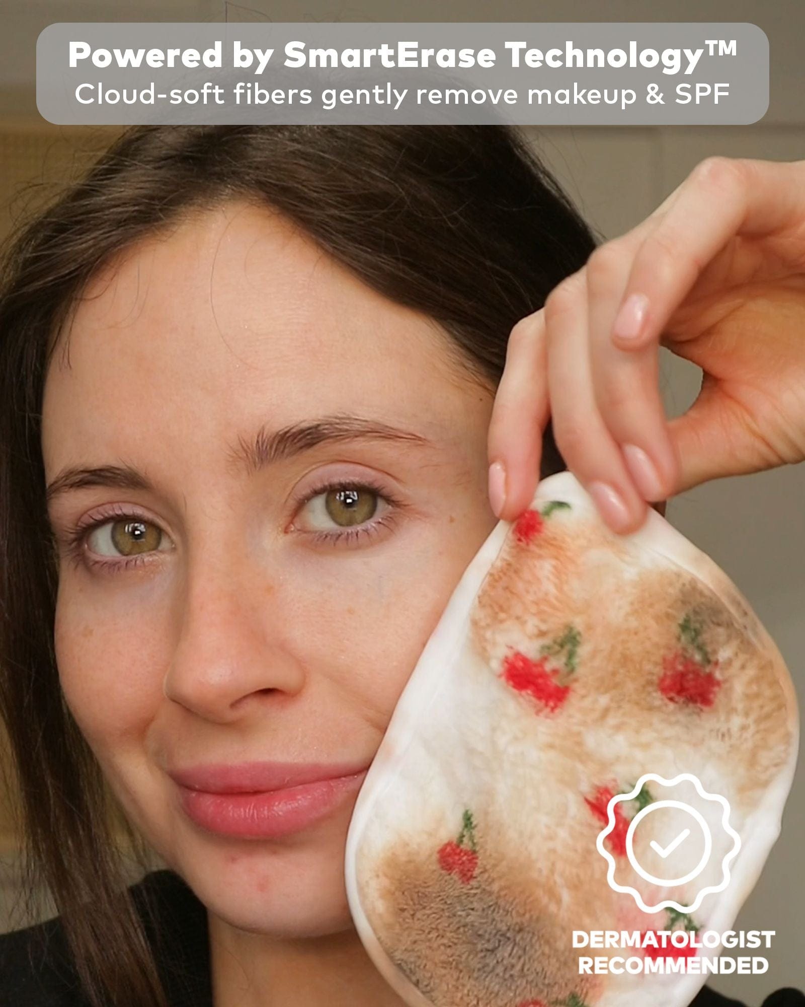 Erase all makeup with JUST WATER™ including waterproof. Our patented, water-activated, cloud-soft fibers gently & easily remove all makeup & sunscreen from pores. 2 in 1 benefit: one side erases makeup & one side exfoliates skin.