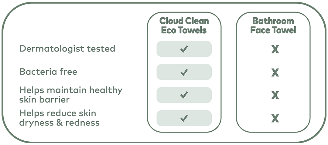 Made from 100% biodegradable* eucalyptus fiber, Cloud Clean Eco Towels are dermatologist & clinically-tested single-use towels designed to be as gentle as they are effective. Unlike traditional washcloths that can trap dirt and bacteria, these hygienic, bacteria-free towels help maintain a healthy skin barrier while reducing dryness & redness.