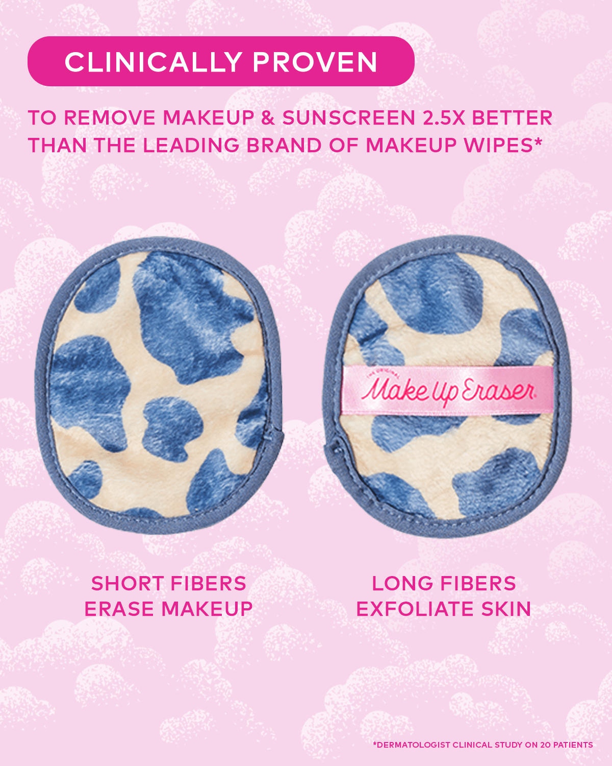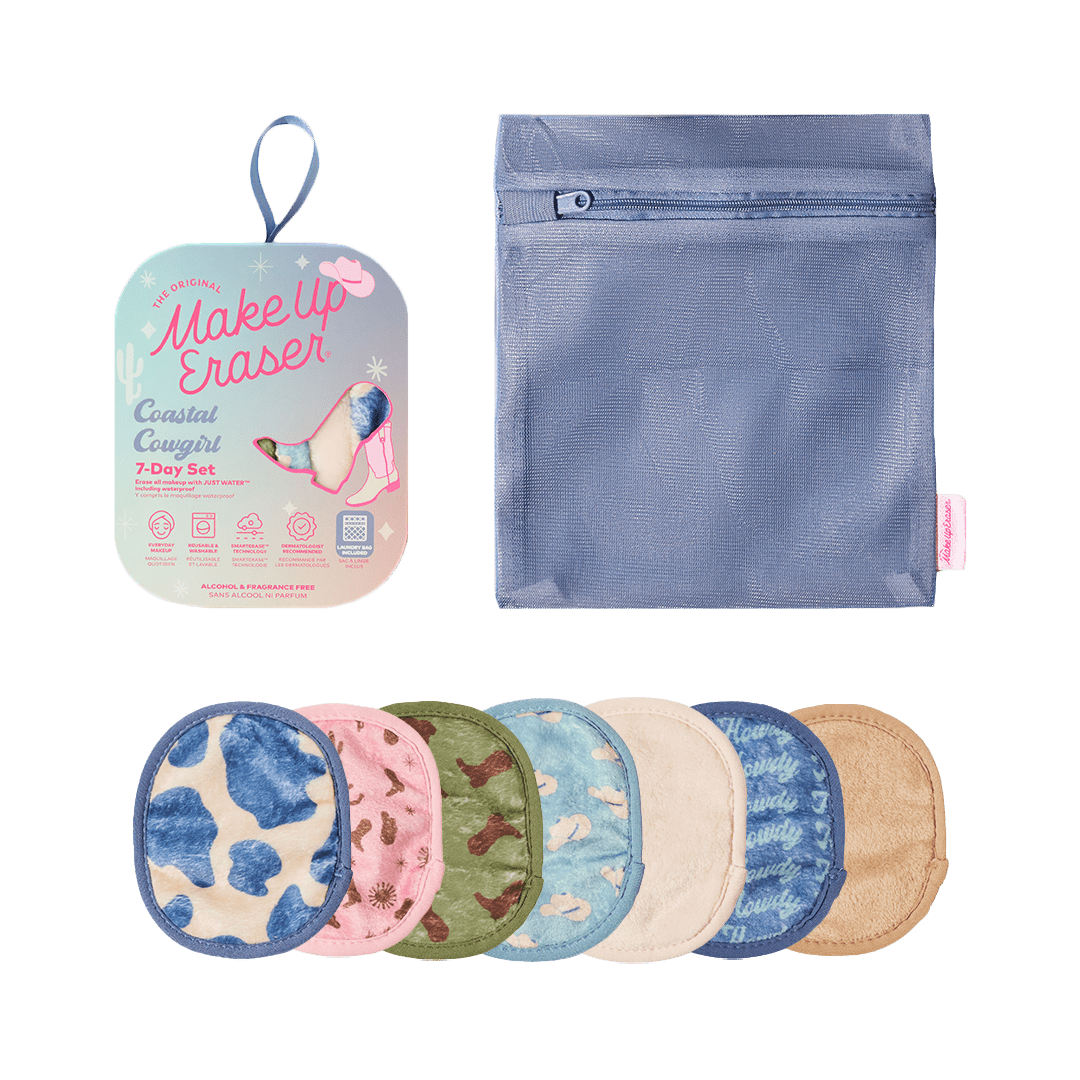 Erase all makeup with JUST WATER™ including waterproof. Our patented, water-activated, cloud-soft fibers gently & easily remove all makeup & sunscreen from pores. 2 in 1 benefit: one side erases makeup & one side exfoliates skin.