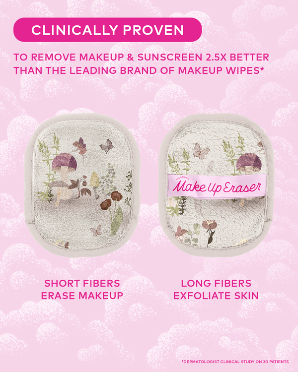 Erase all makeup with JUST WATER™ including waterproof. Our patented, water-activated, cloud-soft fibers gently & easily remove all makeup & sunscreen from pores. 2 in 1 benefit: one side erases makeup & one side exfoliates skin.