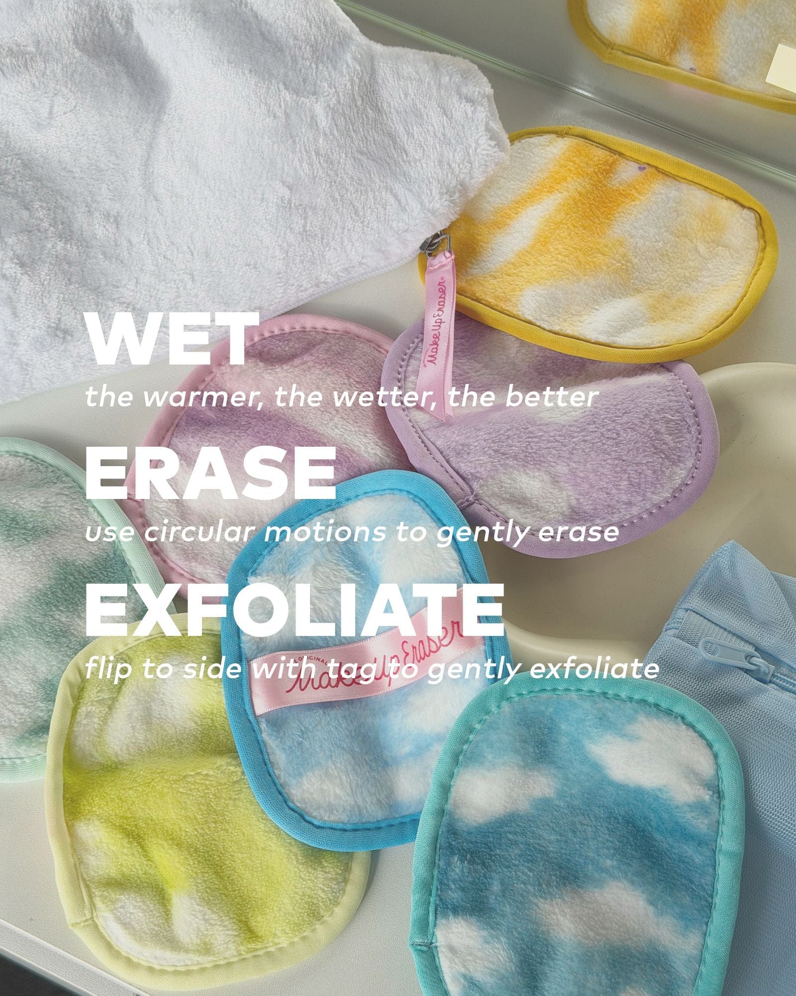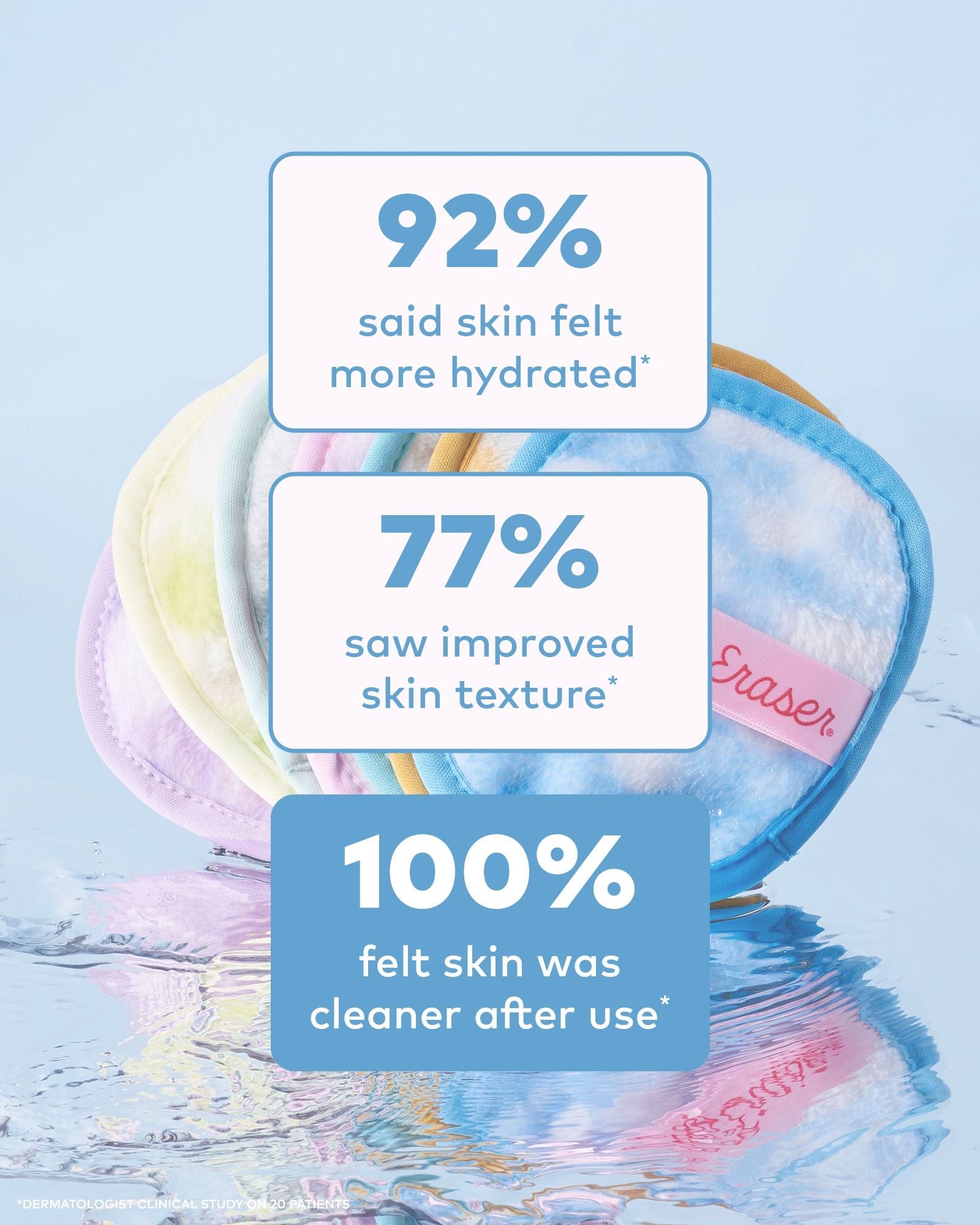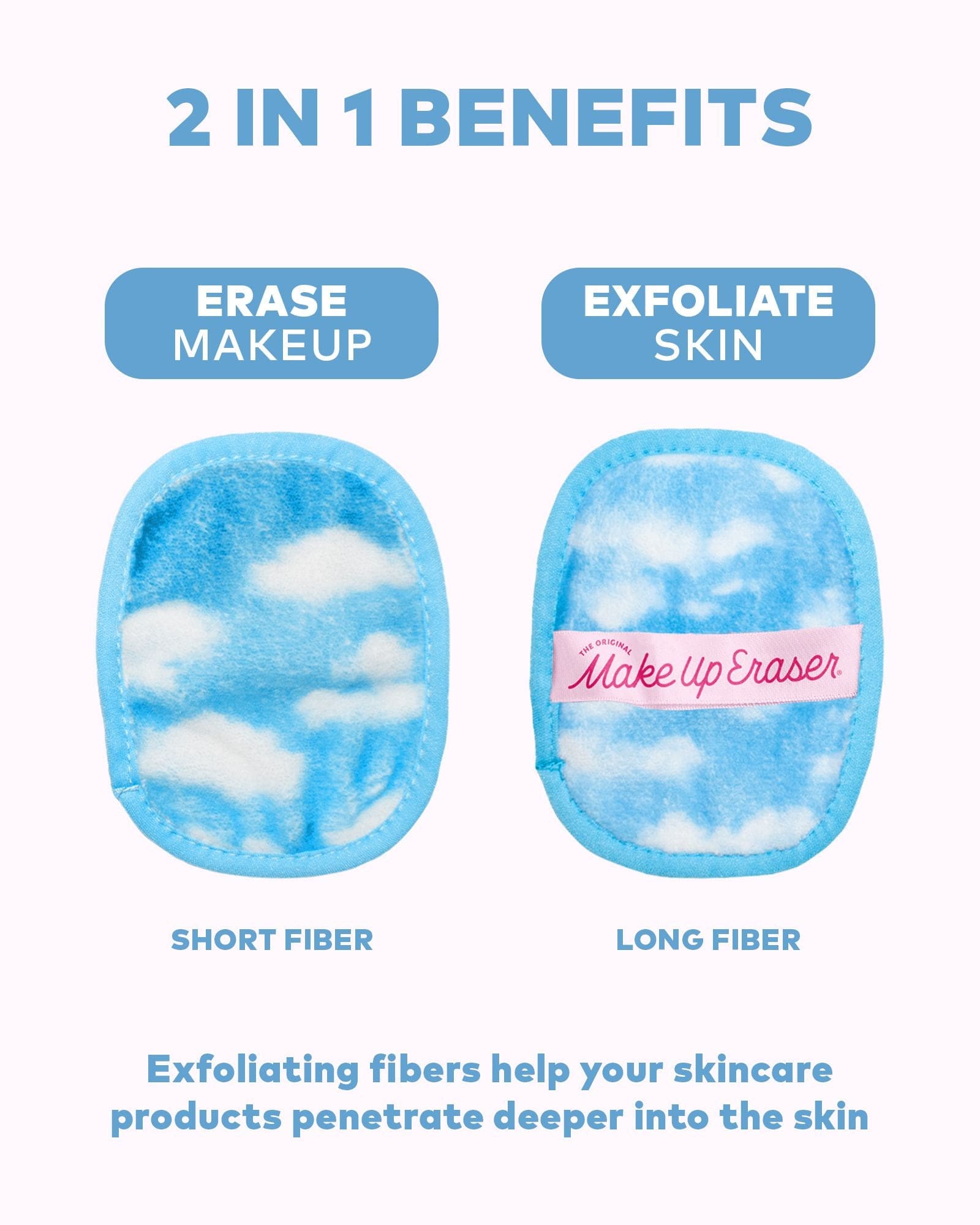 Erase all makeup with JUST WATER™ including waterproof. Our patented, water-activated, cloud-soft fibers gently & easily remove all makeup & sunscreen from pores. 2 in 1 benefit: one side erases makeup & one side exfoliates skin.