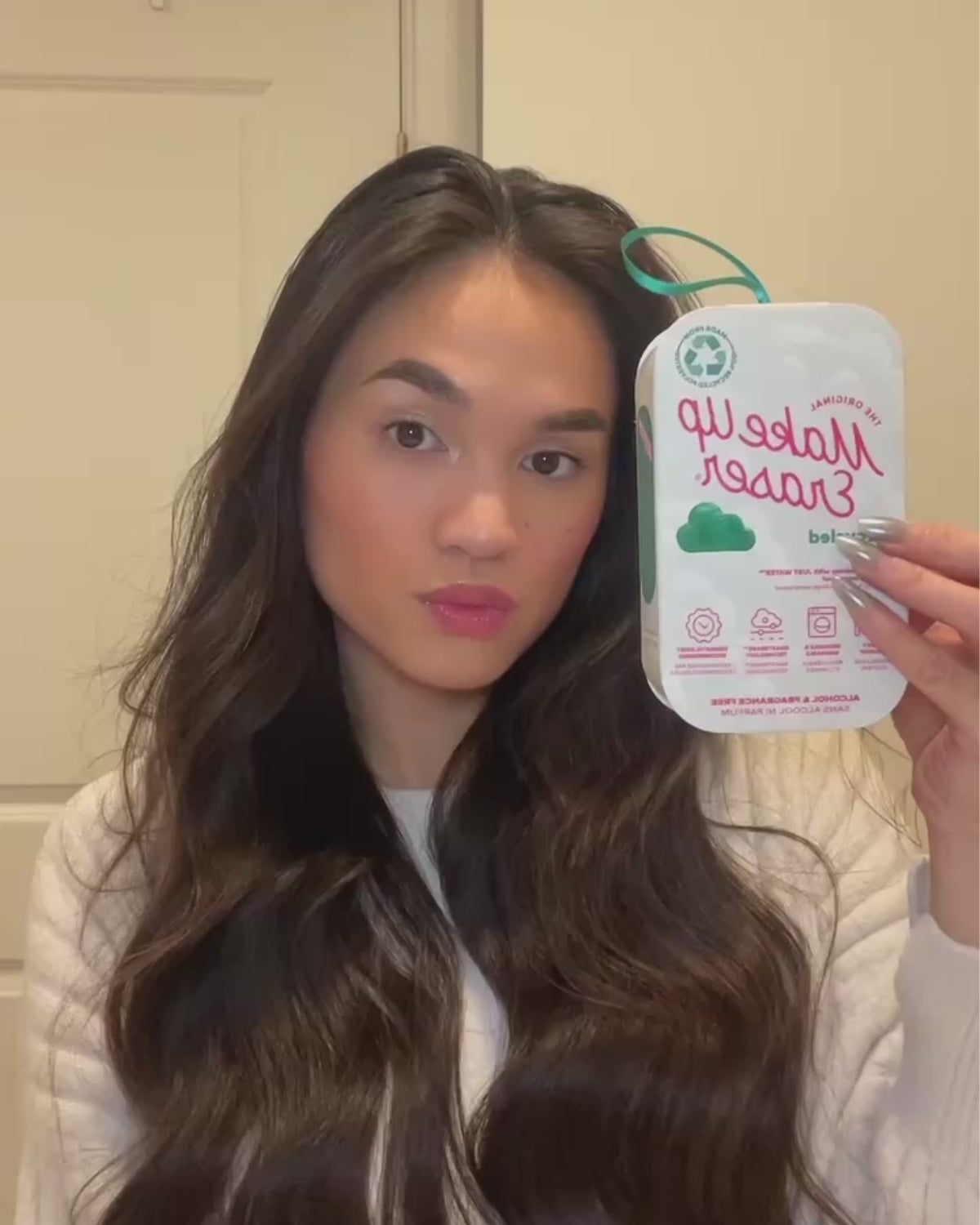 Erase all makeup with JUST WATER™ including waterproof. Our patented, water-activated, cloud-soft, 100% recycled fibers gently & easily remove all makeup & sunscreen from pores. 2 in 1 benefit: one side erases makeup & one side exfoliates skin.