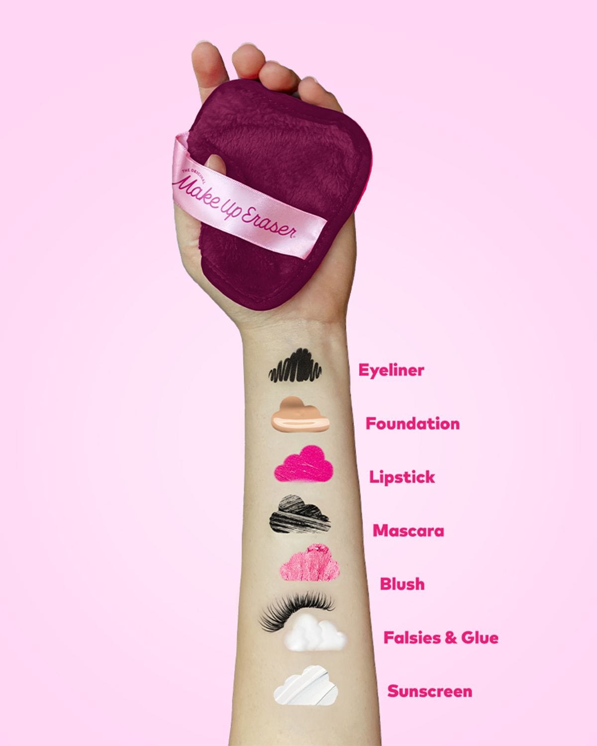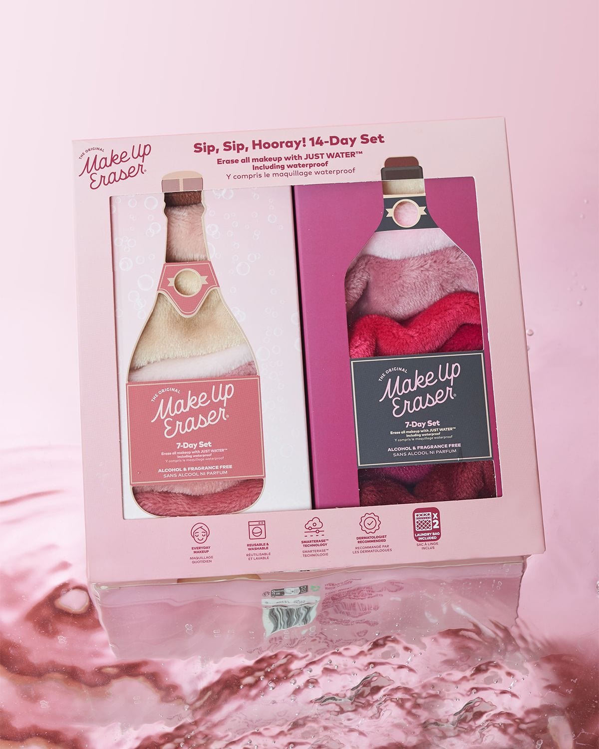 Erase all makeup with JUST WATER™ including waterproof. Our patented, water-activated, cloud-soft fibers gently & easily remove all makeup & sunscreen from pores. 2 in 1 benefit: one side erases makeup & one side exfoliates skin.