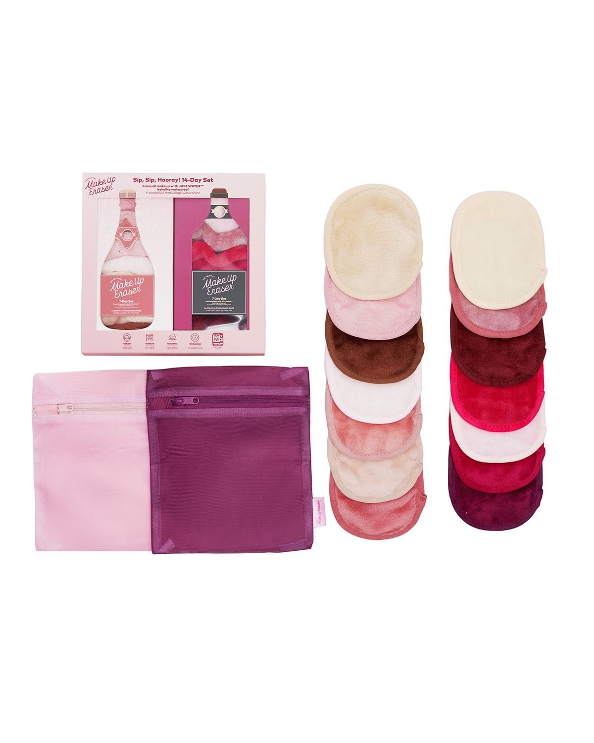 Includes 14 MakeUp Erasers, 5in x 4in. 2 Laundry bags included.